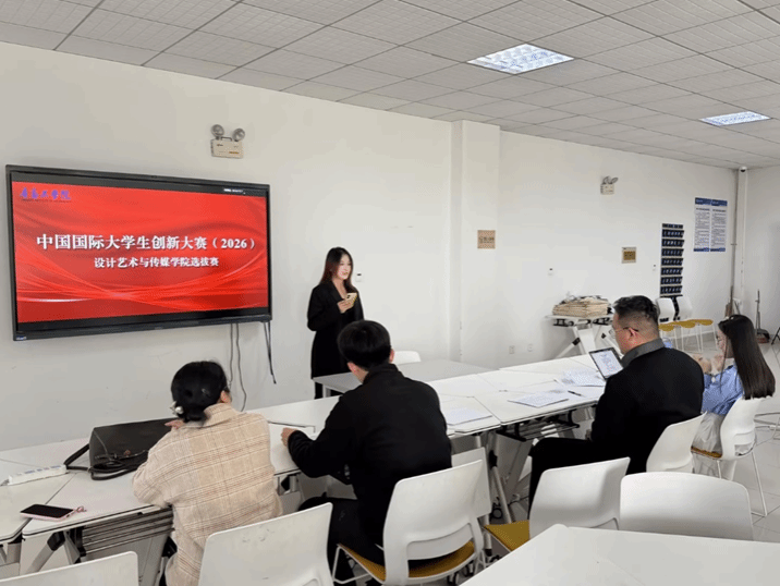 2026 年 3 月 25 日下午,青岛工学院设计艺术与传媒学院在图书馆 411 教室举办中国国际大学生创新大赛(2026)院内选拔赛。经前期筛选,18 个优质项目入围,覆盖视觉传达设计、数字媒体艺术、工业设计等专业。