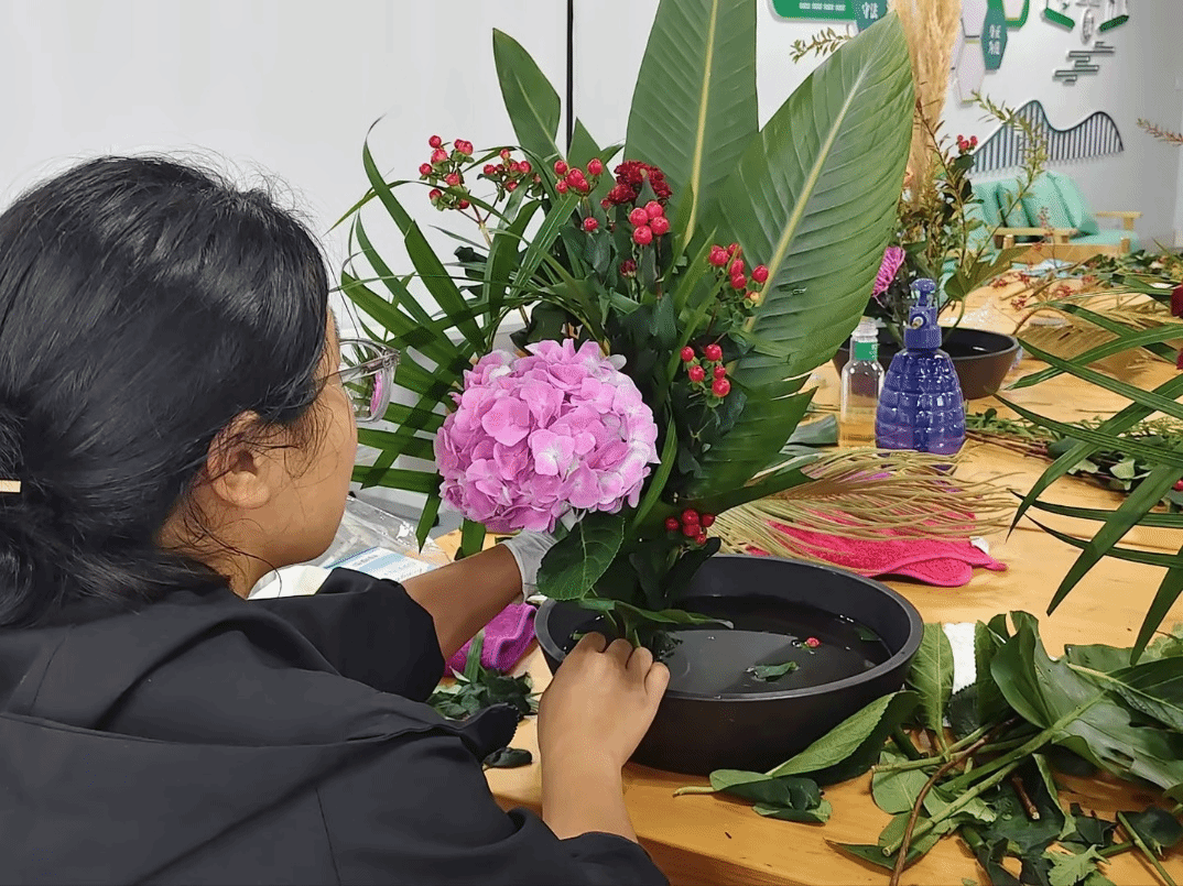 沙龙核心环节为“盆花创作实践”。“看似随意的枝叶摆放,实则暗藏‘疏可走马,密不透风’的章法。”苏老师穿梭于桌间,轻扶学员手腕调整花茎角度:“牡丹菊作为主花需稍向后倾,留出视觉呼吸感;龟背竹叶斜插能打破对称,增添灵动感。”在苏老师的点拨下,一件件作品渐次成型:有的以牡丹菊为中心,配龟背竹叶层叠环绕,如秋日层林;有的用天堂鸟羽叶“划”出弧线,缀以红果芦苇,似山涧流霞。