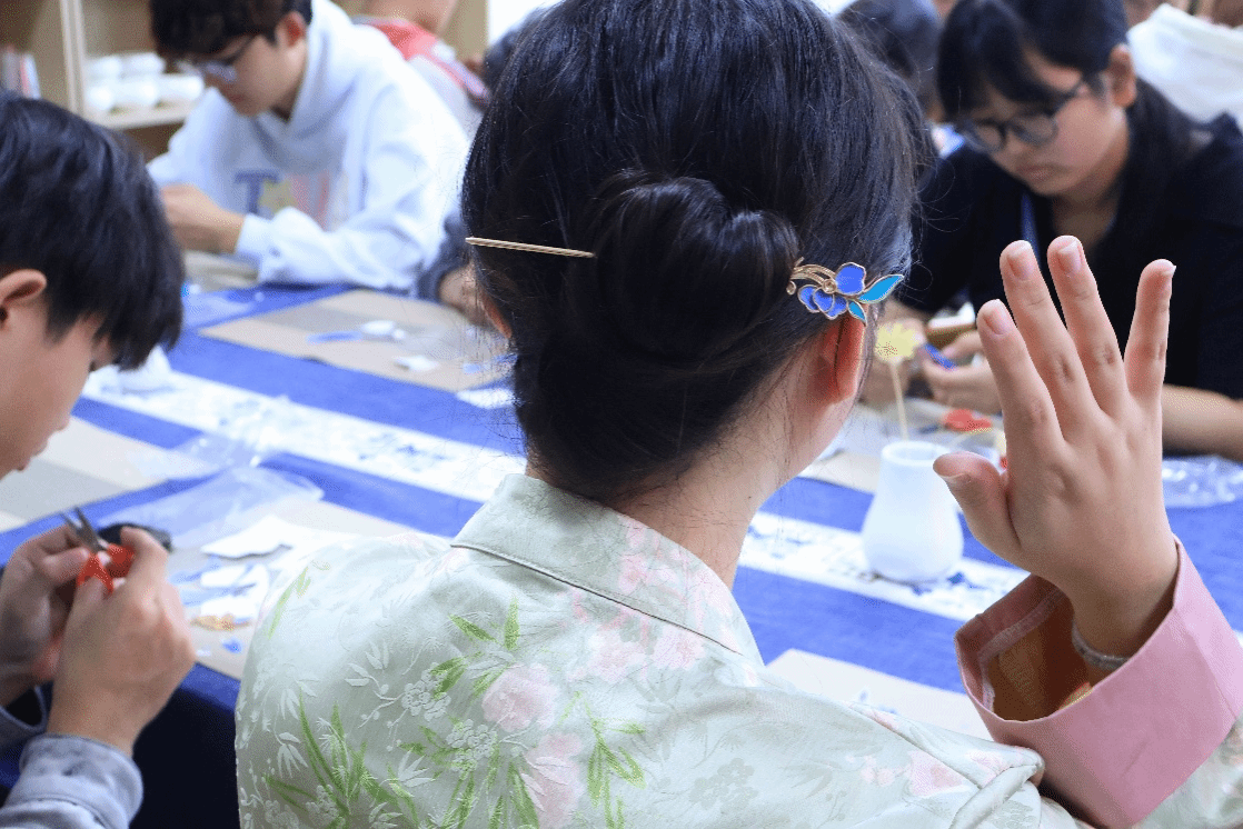 理论讲解后,王老师现场示范点翠发簪制作。从裁剪铜胎底座到粘贴翠羽,从镶嵌珍珠到调整弧度,每一步都细致入微。“翠羽需按光线角度斜贴,才能呈现流动的光泽。”她边操作边强调。部分师生在王老师指导下尝试基础步骤,感受传统工艺“慢工出细活”的匠心。