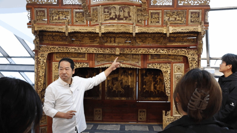 活动伊始,侍教授亲自化身“导游”,带领学生们穿梭于博物馆的藏品之间。他从一件雕刻繁复、精美绝伦的榫卯结构千工床讲起,解析“器以载道”的东方智慧。他指出,床体围栏的龙纹雕刻暗合“天人合一”的哲学思想,牡丹代表的是花开富贵,床两侧的花瓶图案代表的是平平安安。他娓娓道来,由一件家具引申出中国人将人生哲理与生活愿景融入日常器物的独特美学。学生们围在床边,第一次如此清晰地读懂了木纹里的“密码”,感受到先祖对美好生活的质朴向往与智慧结晶。