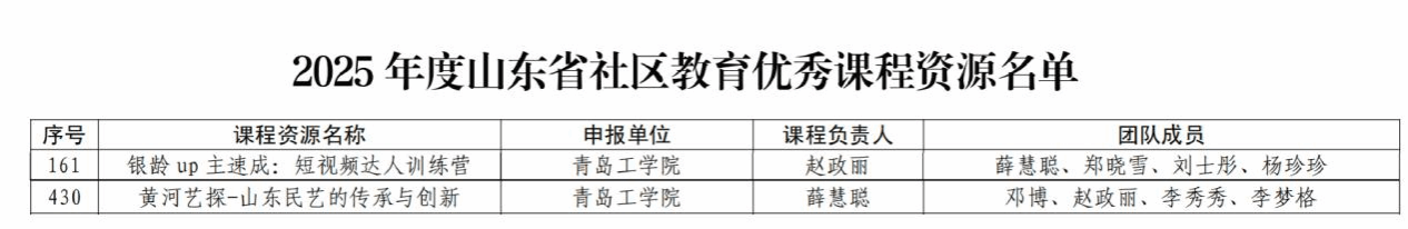 近日,山东省教育厅发布2025年度山东省社区教育优秀课程资源遴选结果公示,设计传媒与艺术学院申报的《银龄up主速成:短视频达人训练营》《黄河艺探——山东民艺的传承与创新》两门课程成功入选,获评为省级社区教育优秀课程资源。